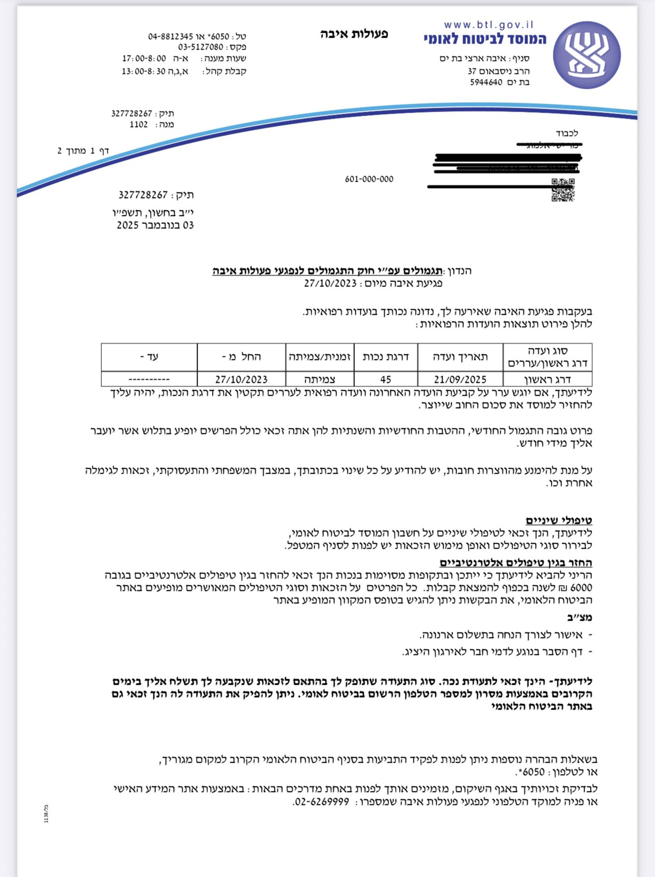 הטיפול כולל עמידה מול ועדות רפואיות, עררים, הגשת תביעות והוכחת הזכאות עד לקבלת הפיצוי.